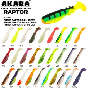 Akara Raptor - одна из самых популярных и уловистых приманок, представляет собой классический виброхвост с массивной пяткой. Raptor с успехом применяется рыбаками на любых водоемах, для ловли трофейного хищника. Оригинальная конструкция ребер на хвосте риппера придает ему активную, мощную, широкоамплитудную игру. Основными объектами охоты этой приманки являются щука, судак и крупный окунь. Подходит для оснащения классической джиг-головкой и для использования на шарнирной оснастке с двойником. Выпускается в размерах 55, 70, 90 мм.