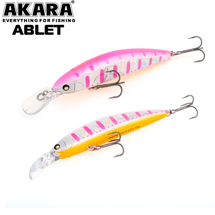Akara Ablet 90S - воблер создан для ловли на течении и обладает отличными полётными качествами. Магнитная система заброса позволяет забросить его на дистанцию 70, а при правильно подобранной снасти даже до 100 метров. Приманка в первую очередь рассчитана на ловлю лососёвых рыб и успела принести не мало трофеев, среди которых были особи весом более 20 кг. Как показала практика, приманка также прекрасно ловит: щуку, окуня, судака, жереха и даже голавля. При чём в стоячей воде воблер ловит ничуть не хуже, чем на течении.