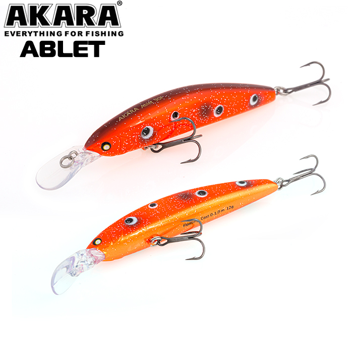 Akara Ablet 90F - воблер создан для ловли на течении и обладает отличными полётными качествами. Магнитная система заброса позволяет забросить его на дистанцию 70, а при правильно подобранной снасти даже до 100 метров. Приманка в первую очередь рассчитана на ловлю лососёвых рыб и успела принести не мало трофеев, среди которых были особи весом более 20 кг. Как показала практика, приманка также прекрасно ловит: щуку, окуня, судака, жереха и даже голавля. При чём в стоячей воде воблер ловит ничуть не хуже, чем на течении.