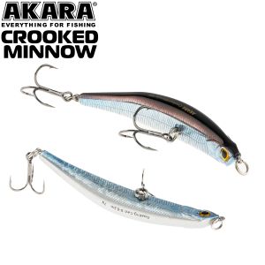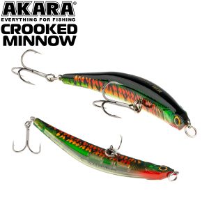 Akara Crooked Minnow – плавающий безлопастной воблер оригинальной формы. Отлично подходит для ловли по небольшим глубинам. Неповторимая игра на рывковой проводке позволяет облавливать даже маленькие окошки среди водной растительности. Допускает равномерную проводку. Основным объектом ловли для этой приманки выступает щука, а также окунь. Оснащен крючками из высокоуглеродистой стали.