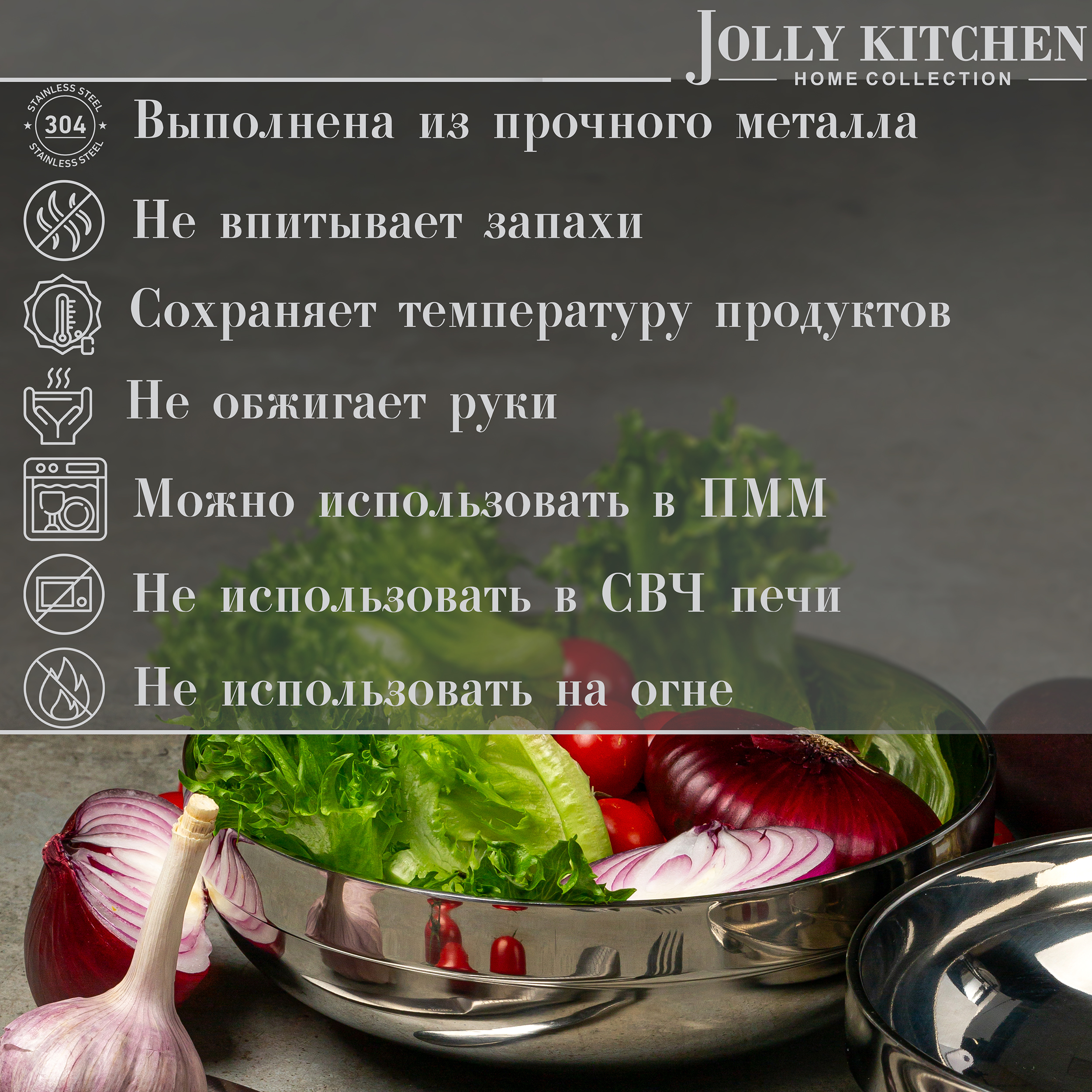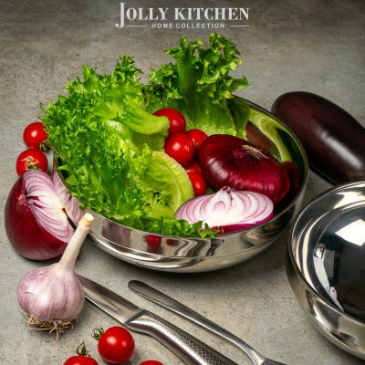 Кухонная миска с двойными стенками Jolly Kitchen — это стильный и функциональный аксессуар, который станет незаменимым помощником на кухне. Она имеет элегантный дизайн с матовой полировкой, что делает её не только практичным, но и красивым предметом сервировки.
