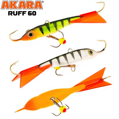 Akara Ruff - достаточно крупный балансир длинной 50 миллиметров и весом целых 9 грамм. Приманка оснащена двумя качественными высокопрочными крючками и тройником японской компании Maruto. Тройник крепится на быстросъемной застежке, что дает возможность моментально демонтировать или заменить тройник в случае необходимости. Хвост балансира сделан из прочного морозостойкого пластика и не становится хрупким на холоде, что повышает надежность и срок эксплуатации. Баланисир Akara Ruff показывает спокойную, плавную и изматывающую игру, на которую очень хорошо реагирует судак. Также этот балансир часто используется для ловли в контакте со дном. Akara Ruff окрашивается в контрастные уловистые цвета с применением флуоресцентных UV красок (светятся в ультрафиолетовом диапазоне). Существуют также варианты двухсторонней окраски и окраски с использованием люминесцентных фосфорных красок (светятся в т