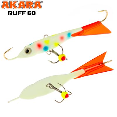 Akara Ruff - достаточно крупный балансир длинной 50 миллиметров и весом целых 9 грамм. Приманка оснащена двумя качественными высокопрочными крючками и тройником японской компании Maruto. Тройник крепится на быстросъемной застежке, что дает возможность моментально демонтировать или заменить тройник в случае необходимости. Хвост балансира сделан из прочного морозостойкого пластика и не становится хрупким на холоде, что повышает надежность и срок эксплуатации. Баланисир Akara Ruff показывает спокойную, плавную и изматывающую игру, на которую очень хорошо реагирует судак. Также этот балансир часто используется для ловли в контакте со дном. Akara Ruff окрашивается в контрастные уловистые цвета с применением флуоресцентных UV красок (светятся в ультрафиолетовом диапазоне). Существуют также варианты двухсторонней окраски и окраски с использованием люминесцентных фосфорных красок (светятся в т