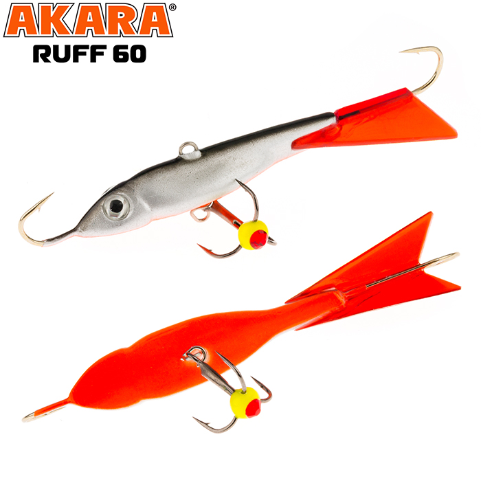 Akara Ruff - достаточно крупный балансир длинной 50 миллиметров и весом целых 9 грамм. Приманка оснащена двумя качественными высокопрочными крючками и тройником японской компании Maruto. Тройник крепится на быстросъемной застежке, что дает возможность моментально демонтировать или заменить тройник в случае необходимости. Хвост балансира сделан из прочного морозостойкого пластика и не становится хрупким на холоде, что повышает надежность и срок эксплуатации. Баланисир Akara Ruff показывает спокойную, плавную и изматывающую игру, на которую очень хорошо реагирует судак. Также этот балансир часто используется для ловли в контакте со дном. Akara Ruff окрашивается в контрастные уловистые цвета с применением флуоресцентных UV красок (светятся в ультрафиолетовом диапазоне). Существуют также варианты двухсторонней окраски и окраски с использованием люминесцентных фосфорных красок (светятся в т