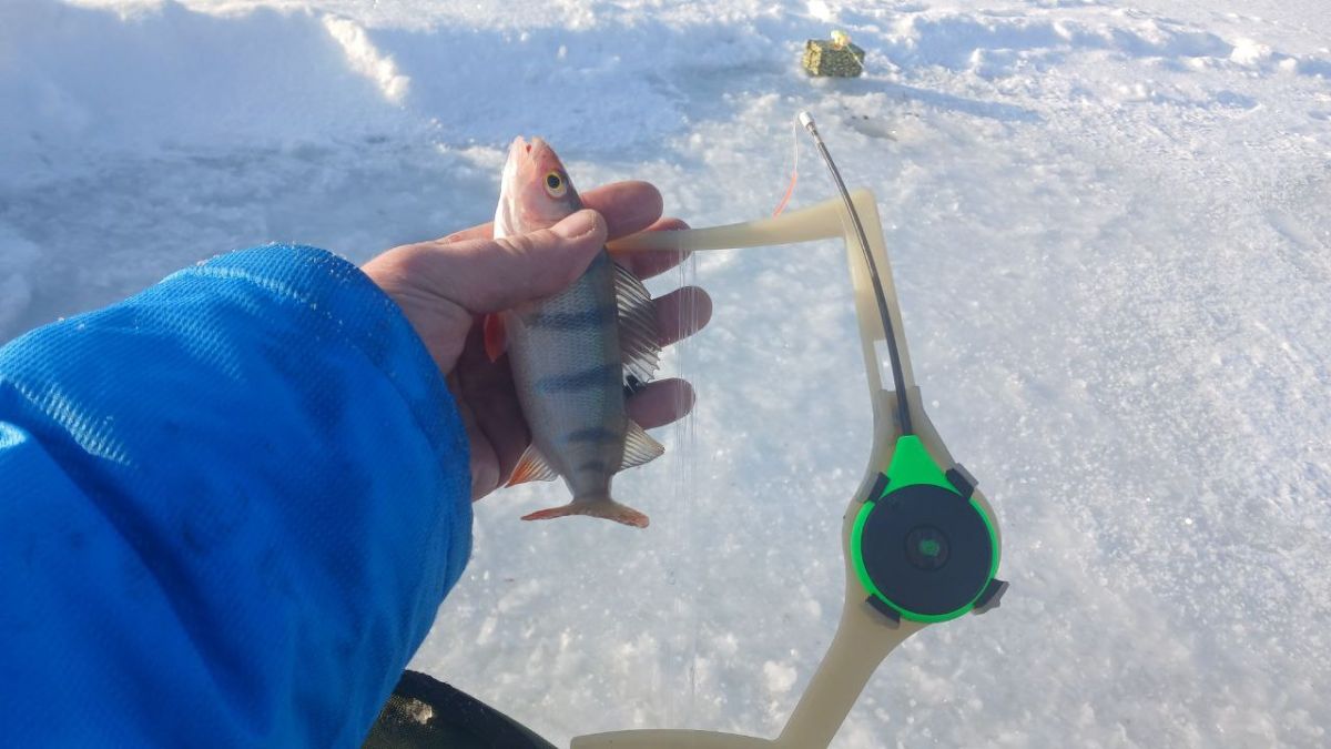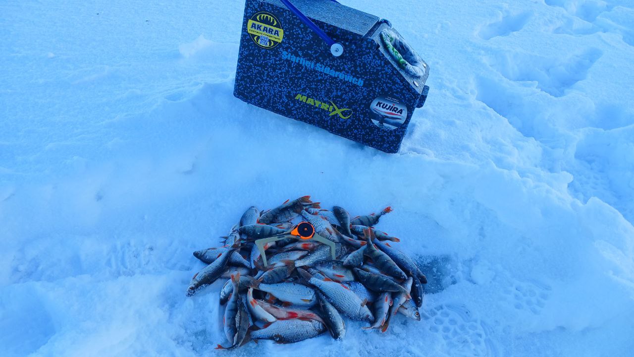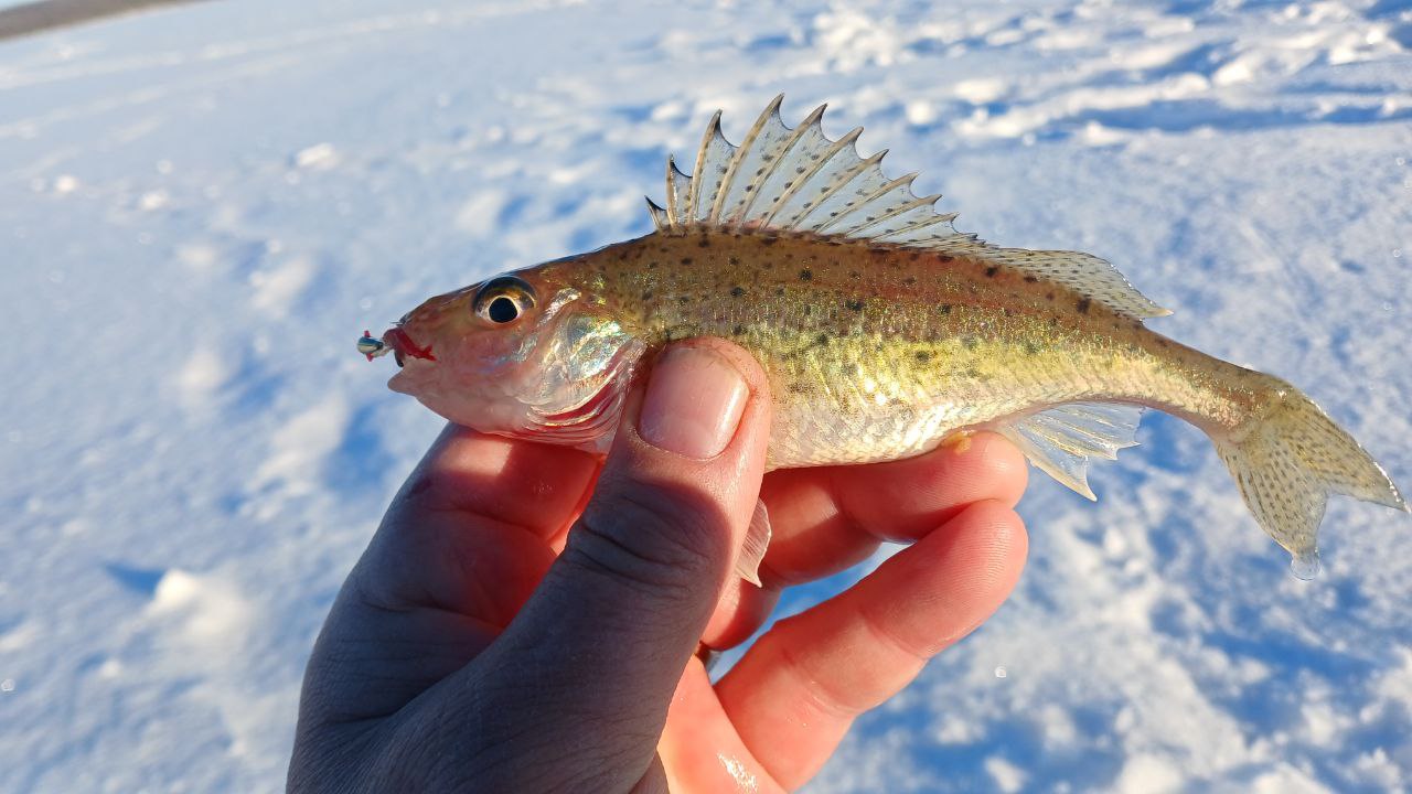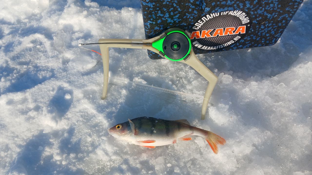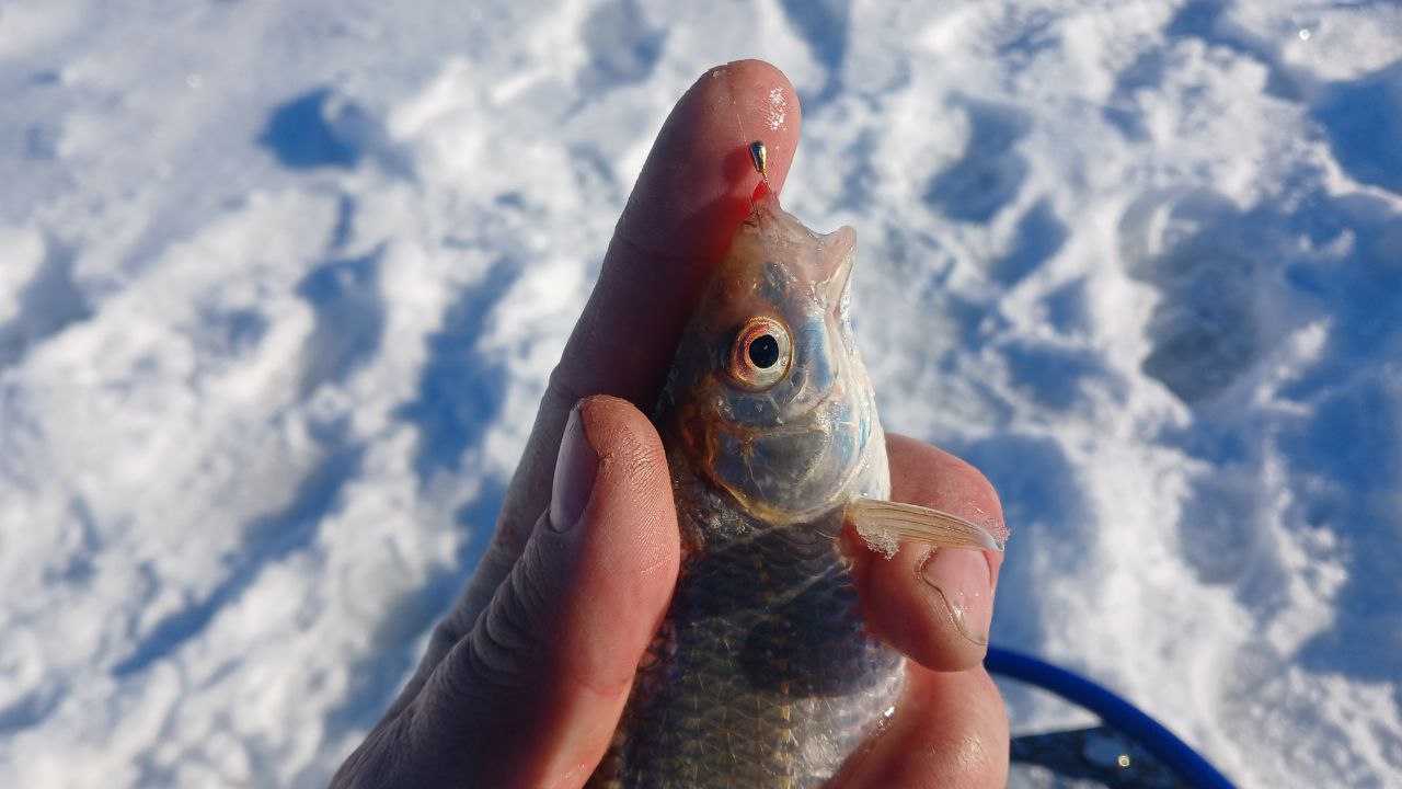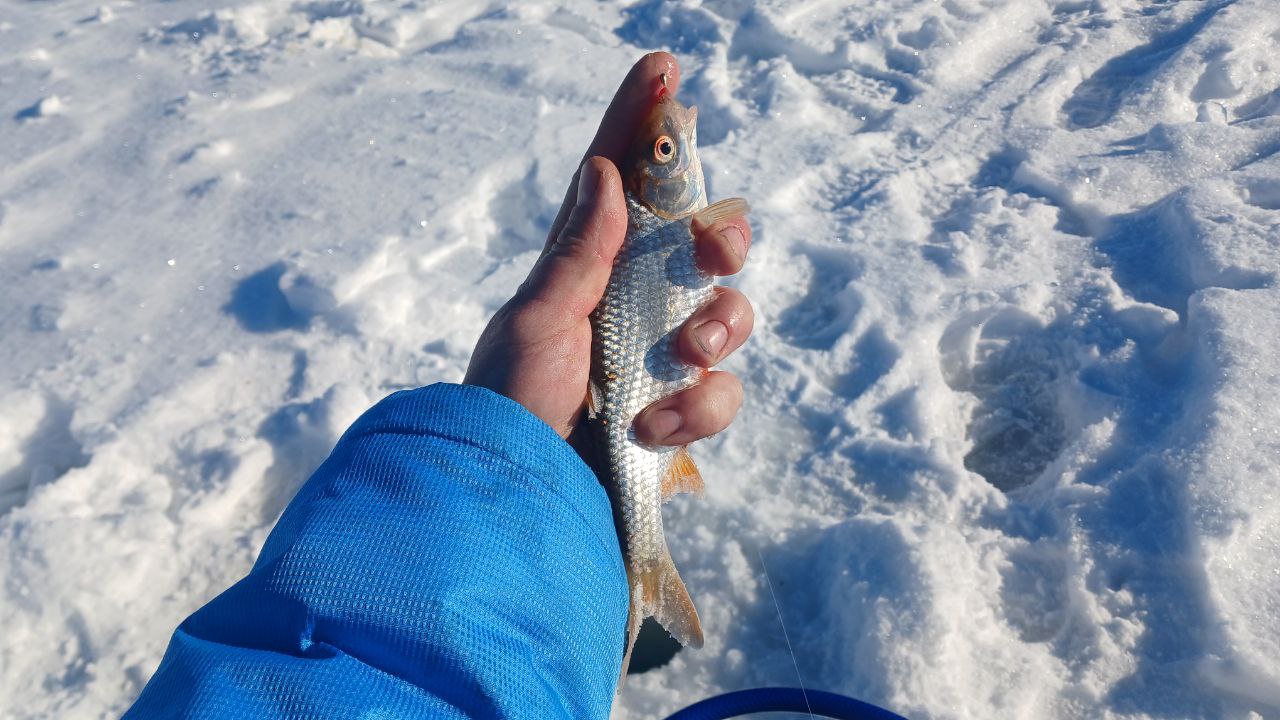 Пока Володя раскармливал лунки в палатке, я принялся обходить закормленные точки в поисках белой рыбы. За часа 2 я поймал пару окуней, из рандомных лунок, и буквально случайно нашёл приямок глубиной 8м в котором стояла плотва.
